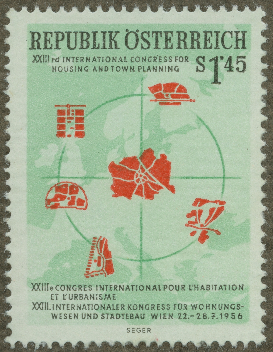 Frimärke från Österrike, 1956. Motiv av Europakarta med sex olika stadsplaner. Längst upp till höger: Vällingby, plan 18:de internationella kongressen för stadsplaner och byggnadsväsen. Wien: 22-28/7 1956.