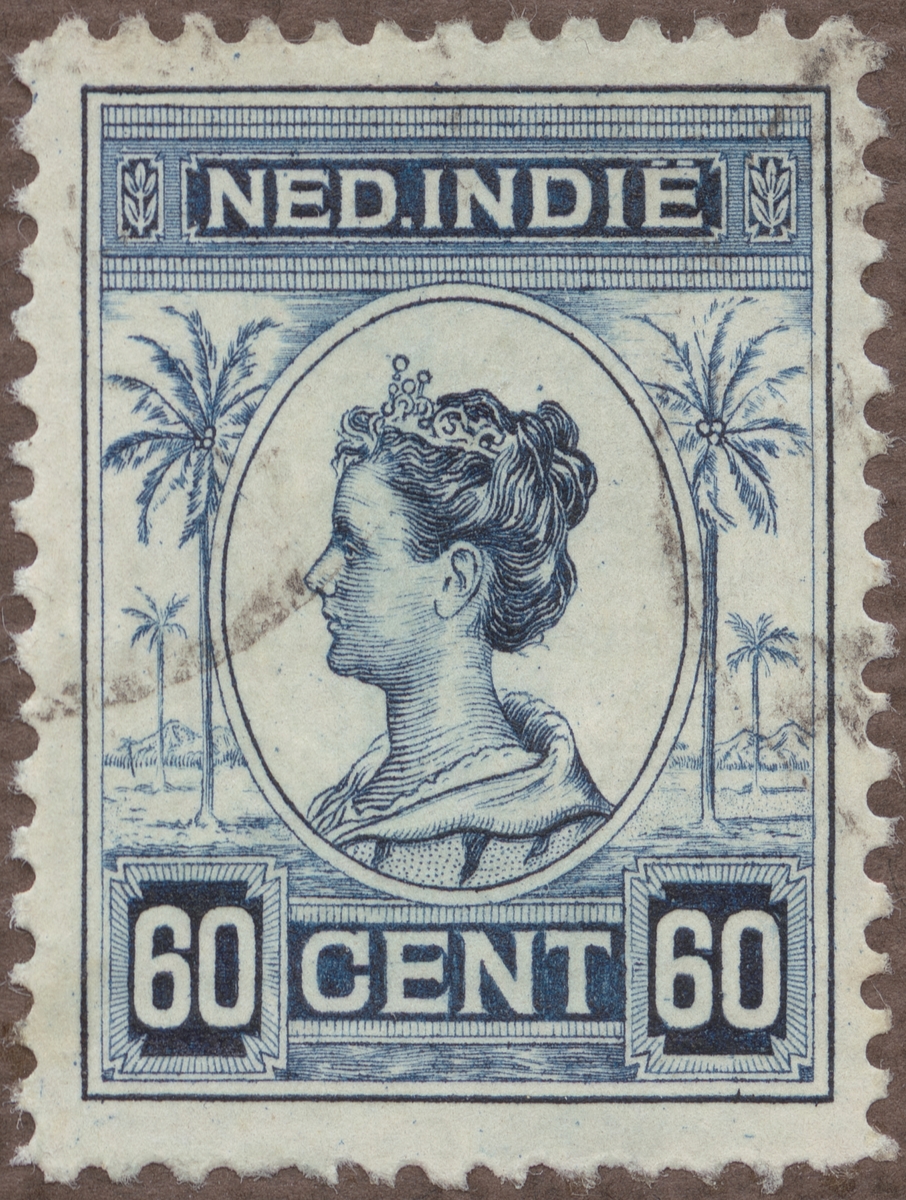 Frimärke från Nederländska Indien, 1913. Motiv av cocospalmer och Drottning Wilhelmina.