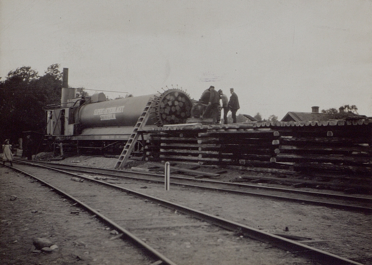 Tillverkning av slipers i mobil anläggning från Slipers-Aktiebolaget, Lessebo år 1910.