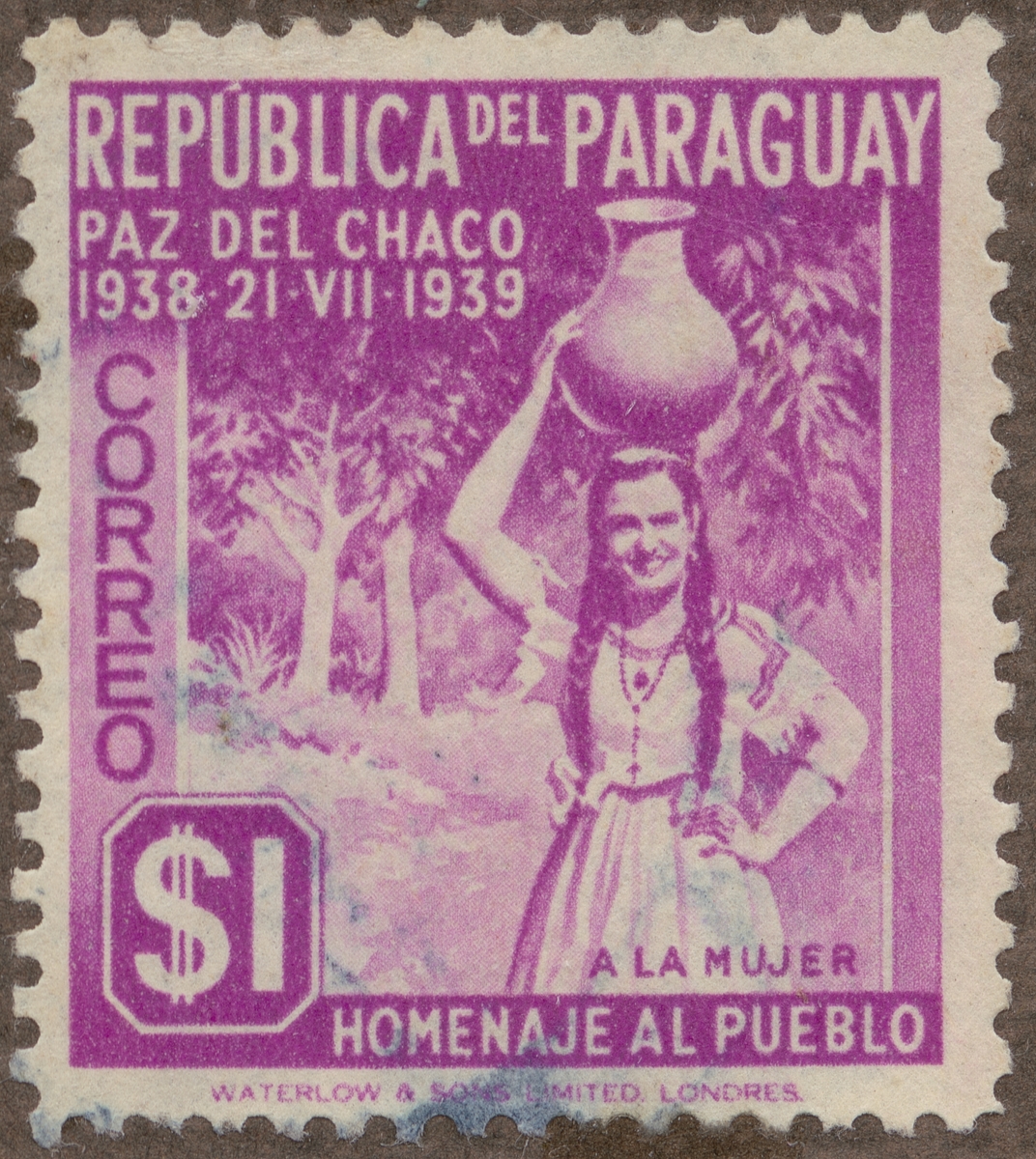 Frimärke ur Gösta Bodmans filatelistiska motivsamling, påbörjad 1950. Frimärke från Paraguay, 1940. Motiv av Primitiv transport "Vattenbärerska" i Paraguay- "- 2-ndra Chaco fredskonferens 1938-1939.- Fredsminnes serie."