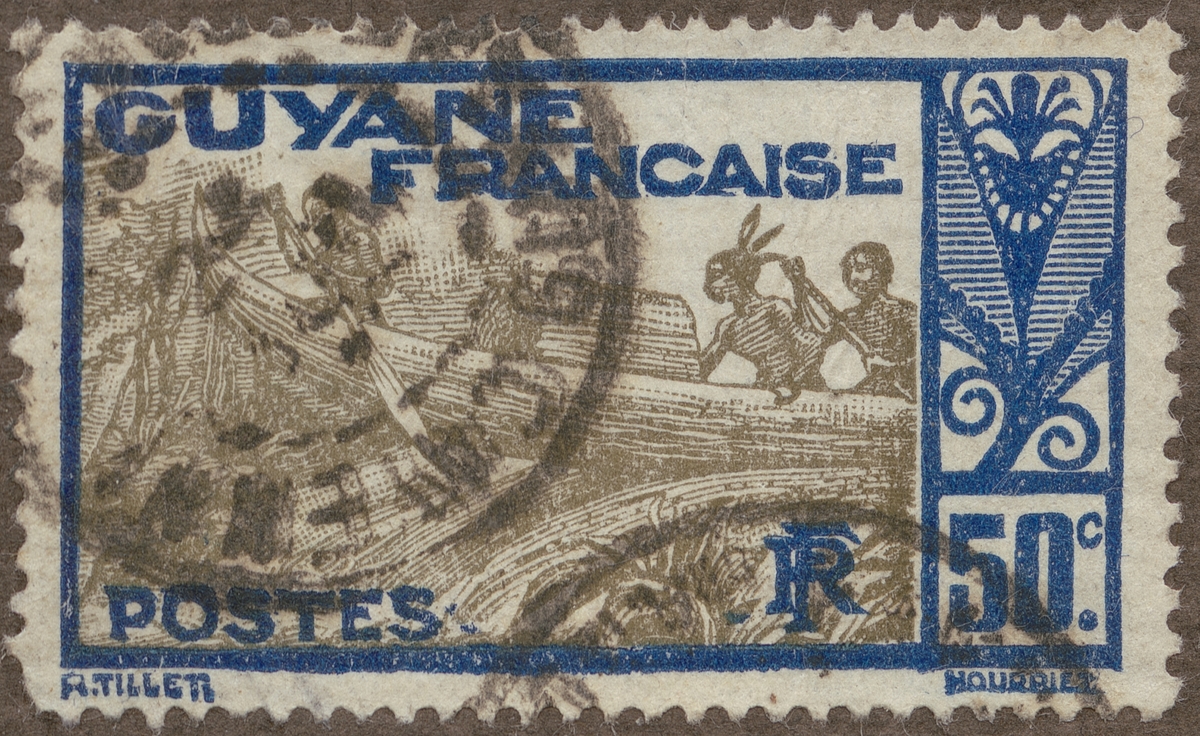 Frimärke från Franska Guyana, 1929. Motiv av Piroger, båt, på floden Maroni