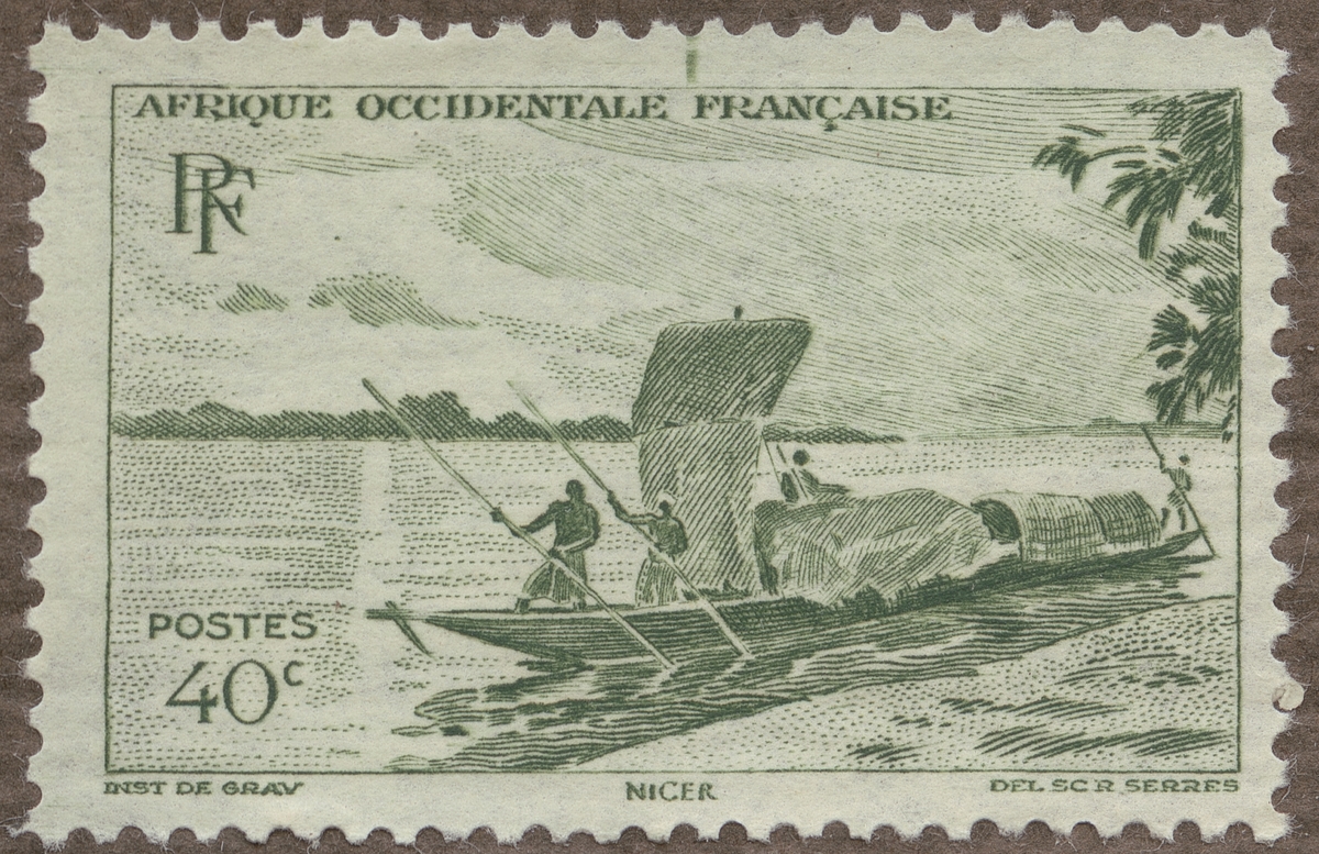 Frimärke från Franska Västafrika, 1947. Motiv av lokal handels- & transportbåt på Nigerfloden. Stakas fram.