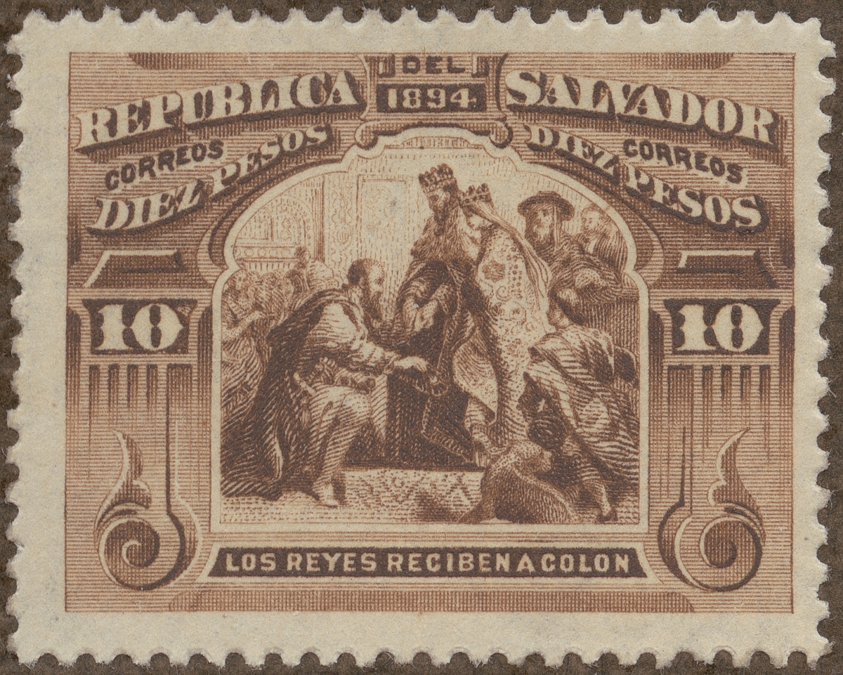 Frimärke från Salvador, 1894. Motiv av Det spanska kungaparet, Kung Ferdinand och Drottning Isabella mottager Columbus.