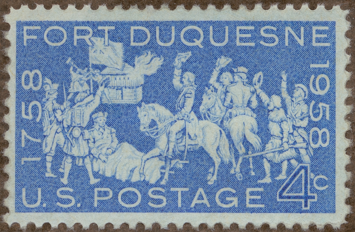 Frimärke från U.S.A., 1958. Motiv av Bild av striden (i mitten) Överste George Washington och (t.v.) Brittiska generalen Forbes Fort Duquesnes erövring 200-årsminne: 1758-1958.