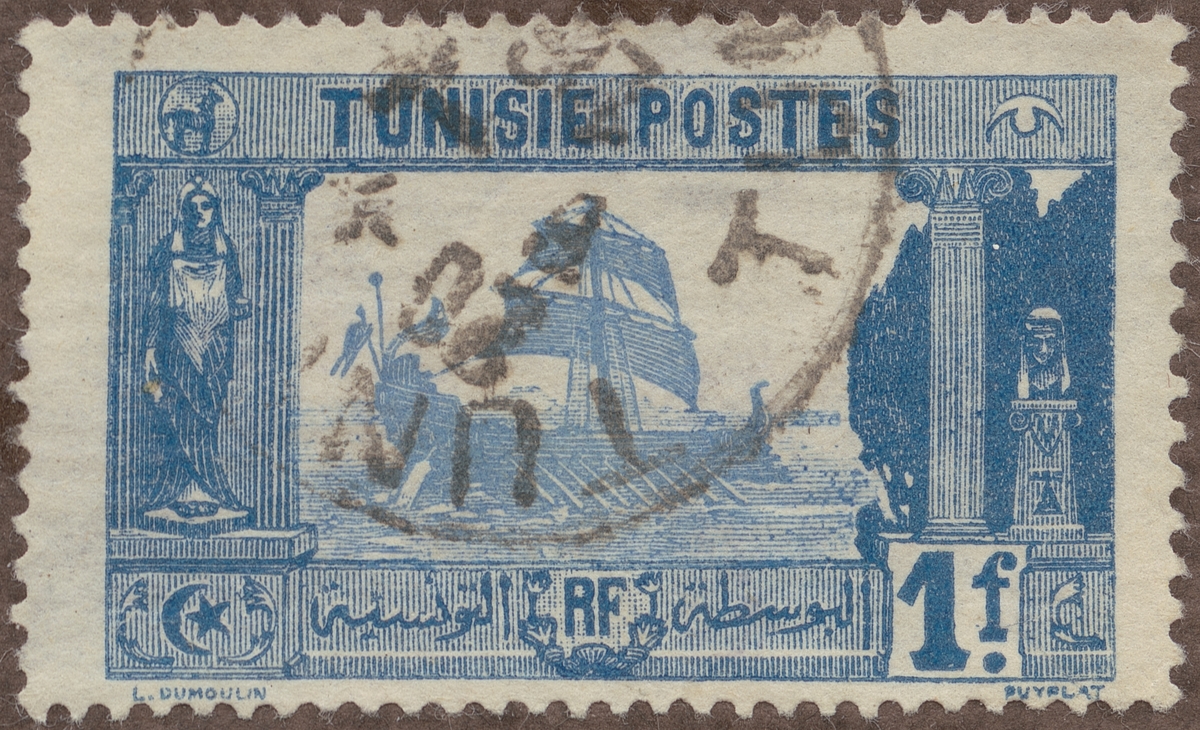 Frimärke från Tunis, 1923. Motiv av Kombinerad segel- och roddbåt - Galèr från Kartagotiden- Fornt. fenisiska staden Kartago förstördes 146 f. Kr. av Rom.