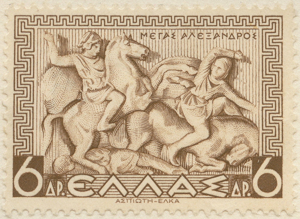 Frimärke från Grekland, 1937. Motiv av Alexander Den store i slaget vid Issos