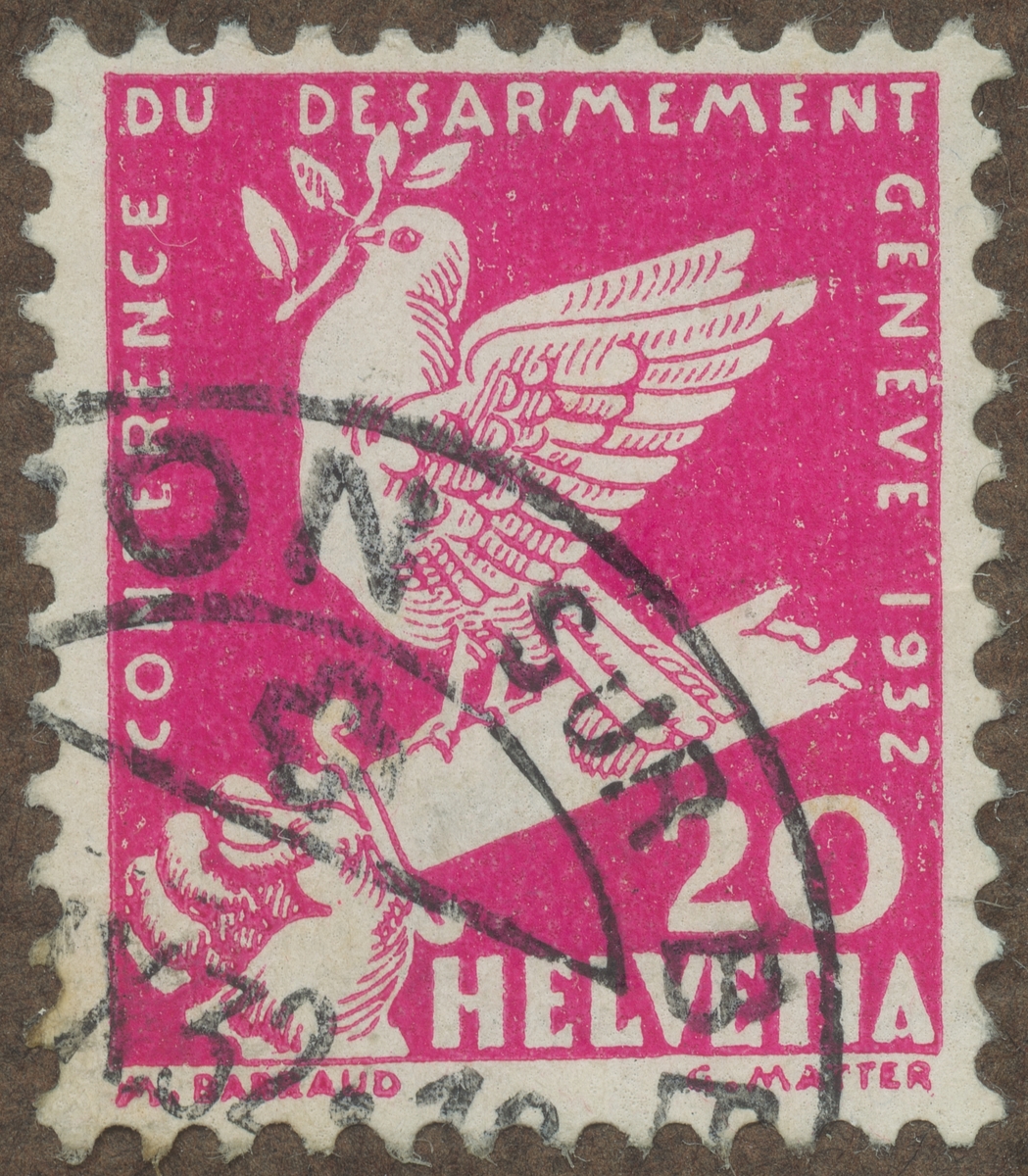 Frimärke från Schweiz, 1932. Motiv av Fredsduva på avbrutet svärd Fredskongress i Geneve 1932