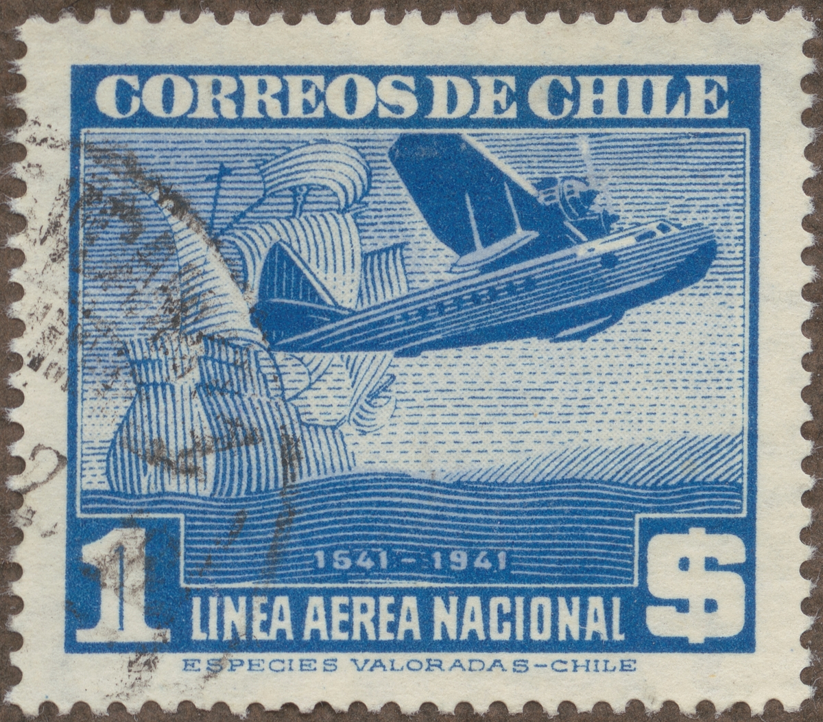 Frimärke från Chile, 1941. Motiv av Fyrmotorigt passagerar-monoplan: 1941 -Segelfartyg: 1541-