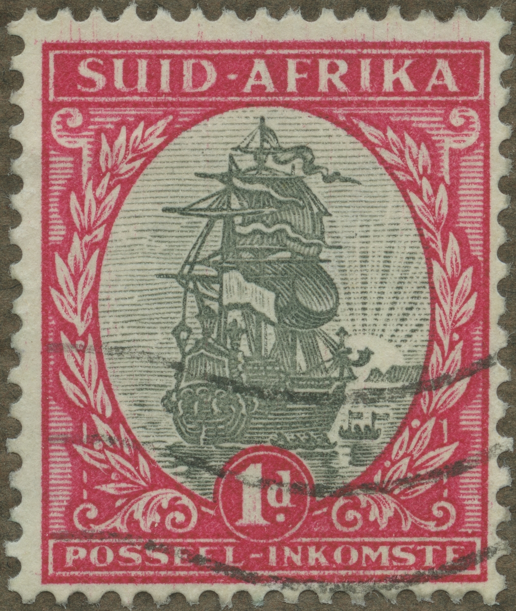 Frimärke ur Gösta Bodmans filatelistiska motivsamling, påbörjad 1950. Frimärke från Sydafr. Unionen, 1926. Motiv av Uppgående sol: "-Gammalt segelfartyg omkr. 1600-talet-"
