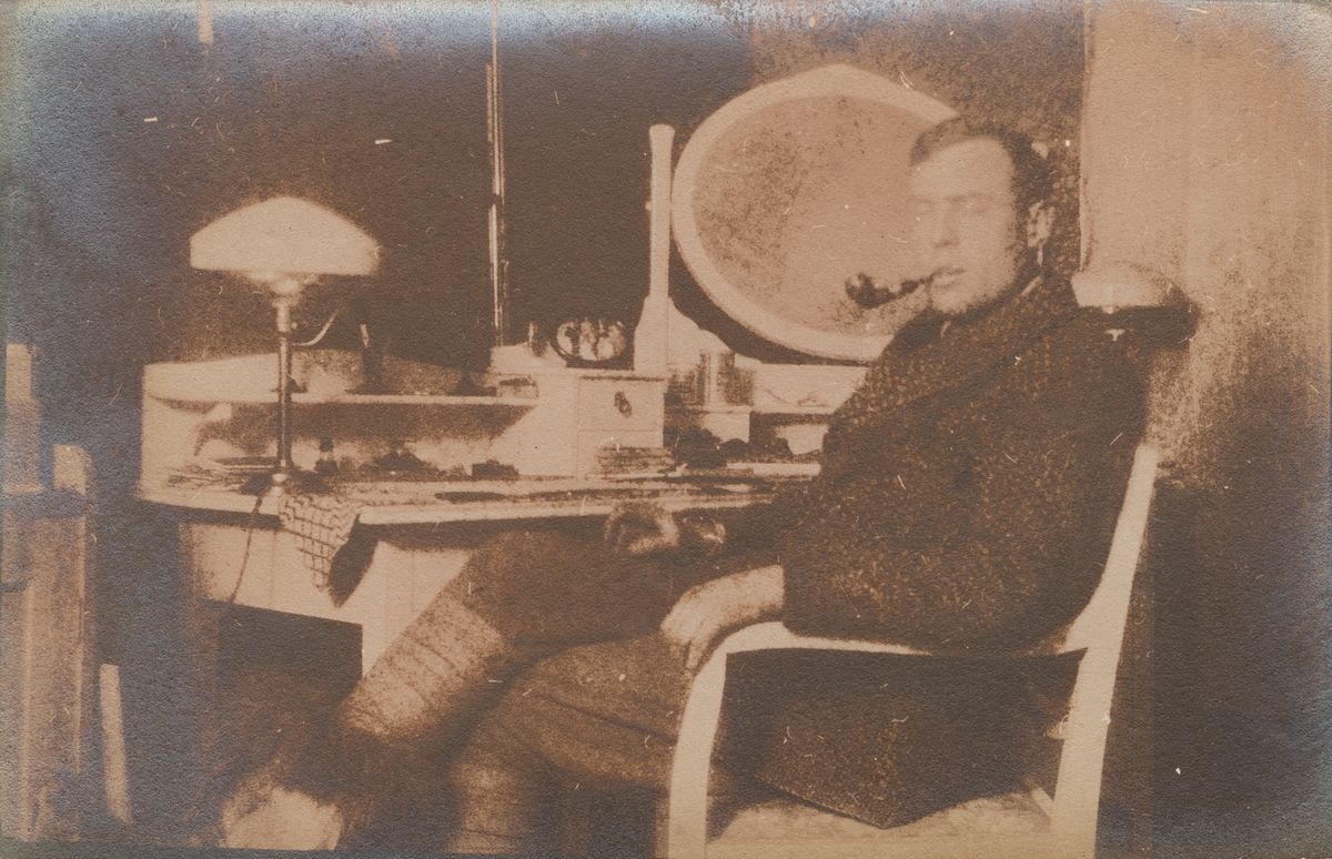 Fotografi från expedition till Spetsbergen. Motiv av piprökande man som sitter i en fåtölj vid ett skrivbord.