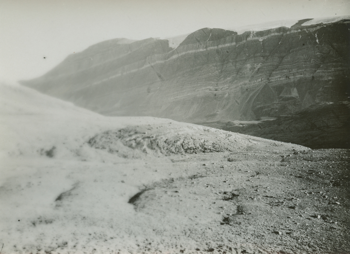 Fotografi från expedition till Östgrönland 1929. Dansk-svensk expedition under ledning av Lauge Koch. Svenska deltagare: Oscar Kulling och Helge Backlund. Närbild av berg.