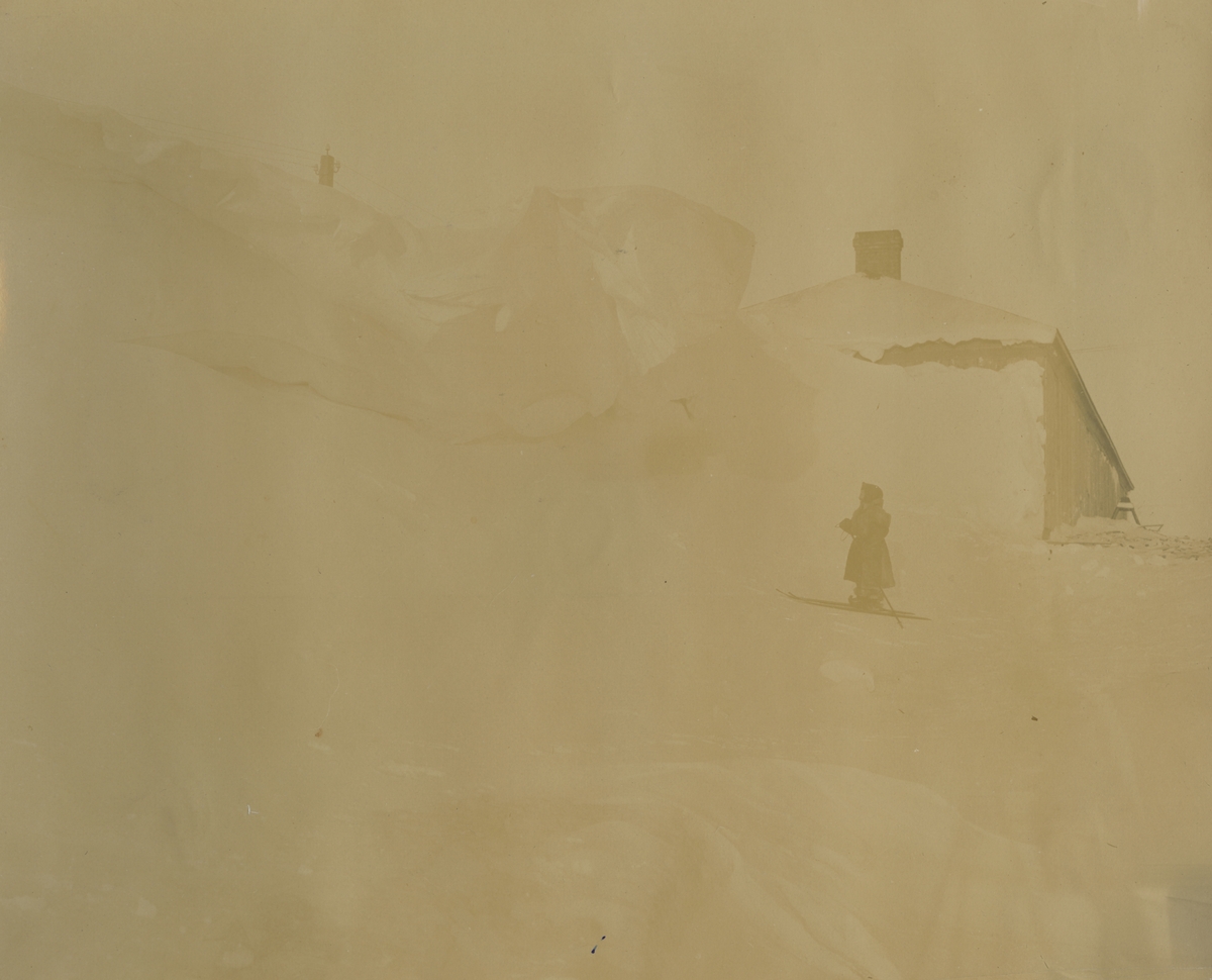 Fotografi från expedition till Spetsbergen. Motiv av barn på skidor vid stor snödriva.