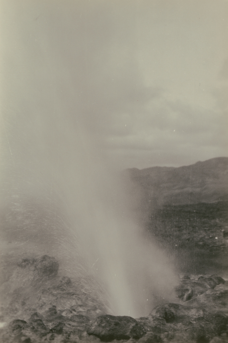 Fotografi från Albin Ahrenbergs resa till Grönland 1929. Motiv av gejser i bergslandskap.