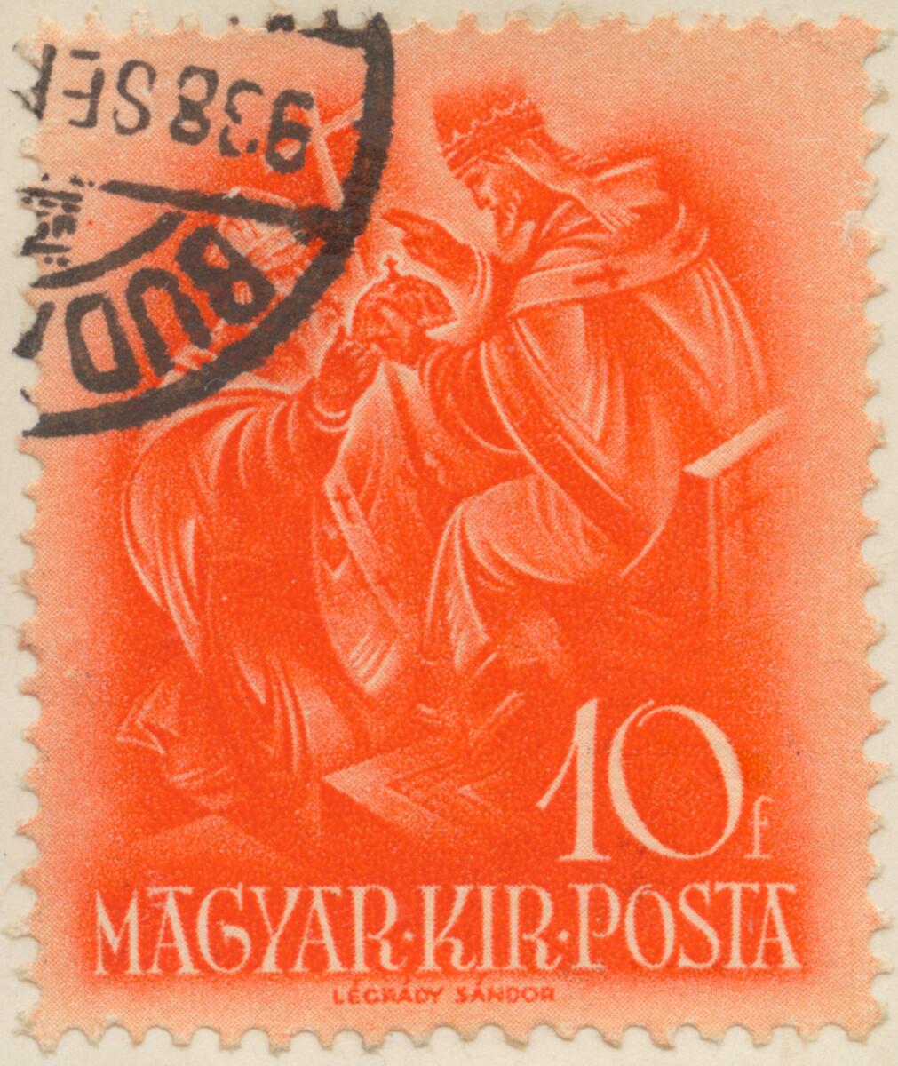 Frimärke från Ungern, 1938. Motiv av S:t Stefanskronan Påven Sylvester II lämnar Ungerns heliga krona (S:t. Stefanskronan) till Abbott Astrik. -900-årsminne av S:t Stefans död.-