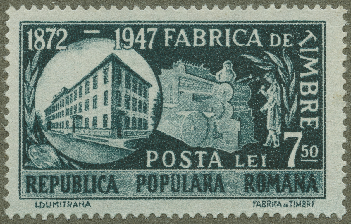 Frimärke från Rumänien, 1947. Motiv av Postens tryckeribyggnad. Tryckmaskin. 75-årsminne av Rumäniens frimärkstryck. 1872-1947.
