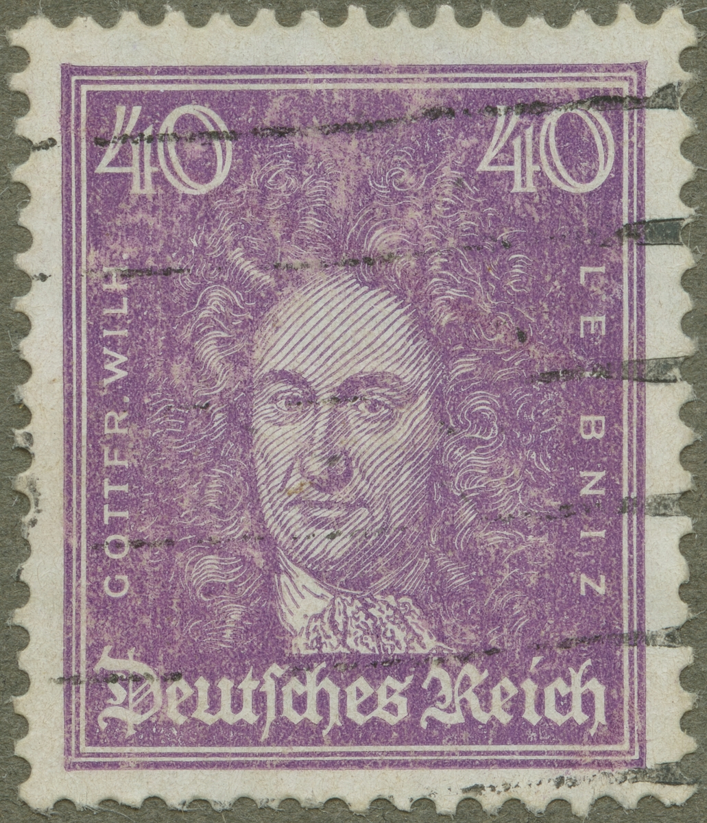 Frimärke från Tyskland, 1926. Motiv av Gottfried Wilhelm von Liebnitz 1646-1716. Tysk filosof. Matematiker. De odelbara monaderna. Differentialkalkylen och integralkalkylen inom matematiken.