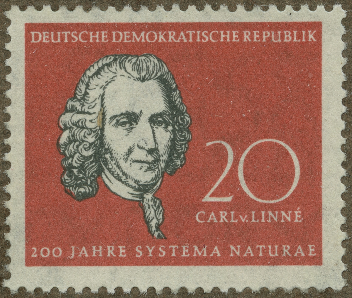 Frimärke från Östtyskland, 1958. Motiv av Carl von Linné: 1707-1778. Svensk botanist. Växtsystematiken. -200-årsminne av "Systema Naturae" (Den kom ut redan 1735)