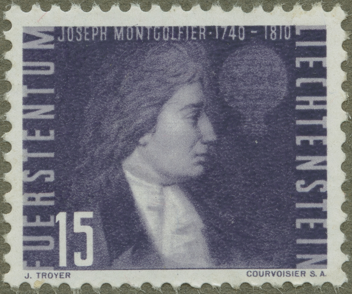 Frimärke från Liechtenstein, 1948. Motiv av Joseph Michel Montgolfier 1740-1810. Fysiker. Fransman. Den första obemannade varmluftsballongen den 4 juni 1783 från den franska staden Annonay. 1500 à 2000 m:s höjd. "Serien: Föregångsmän inom luftfarten."