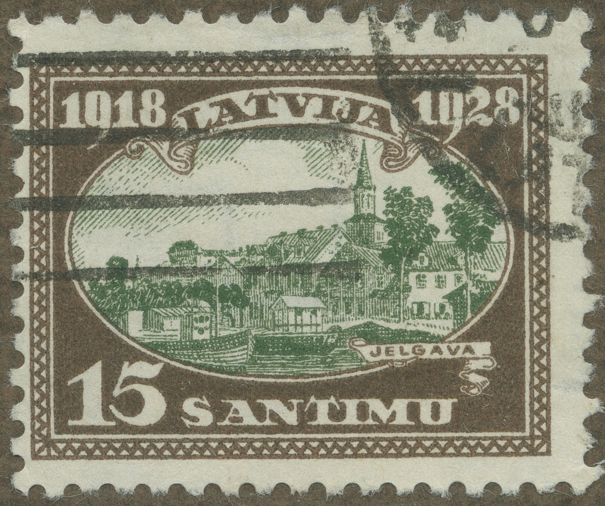 Frimärke från Lettland, 1928. Motiv av Staden Jelgava -10-årsminne av Lettlands oavhängighet: 1918-1928.