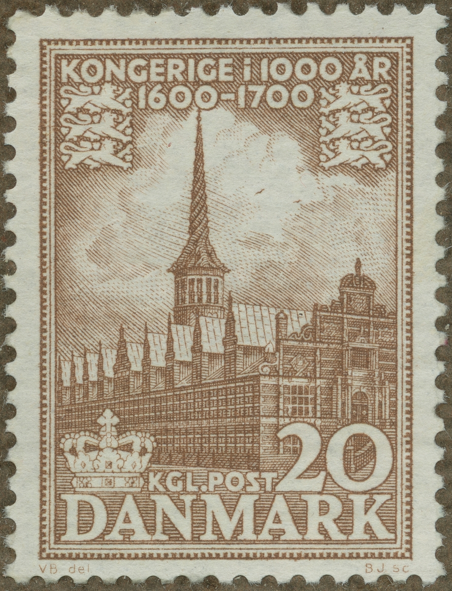Frimärke från Danmark, 1954. Motiv av Stadsbild: Börshuset i Köpenhamn (från 1600-1700-talet) "Serie: Kungariket Danmark 1.000 år."