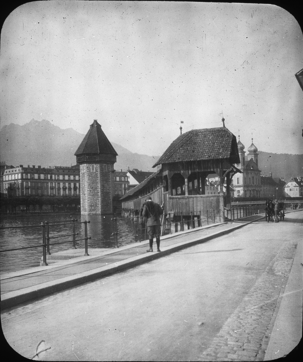 Skioptikonbild med motiv av man vid den övertäckta gångbron Kapellbrücke över floden Reuss i Luzern.