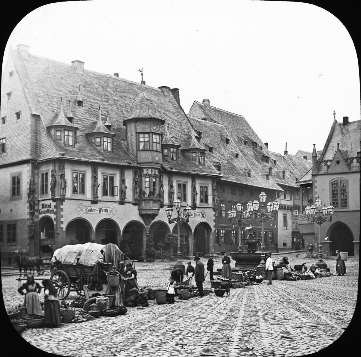 Skioptikonbild. Torgmarknad framför Hotel Kaiserworth i Goslar.