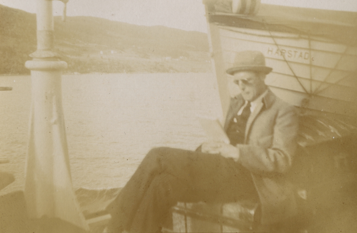 Fotografi från expedition till Spetsbergen. Motiv av man iklädd solglasögon och hatt som läser en bok på en kaj. Bredvid honom ligger båten "Harstad" förtöjd.