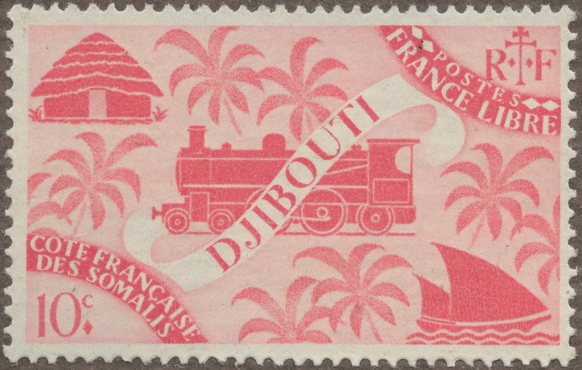 Frimärken ur Gösta Bodmans filatelistiska motivsamling, påbörjad 1950. Frimärke från Franska Somalikusten, 1943. Motiv av Lokomotiv, Segelbåt, Hydda i Djibouti.