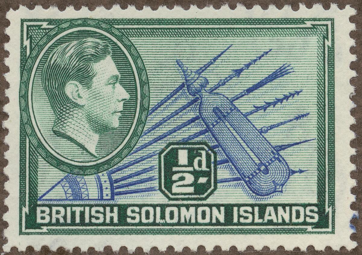 Frimärke från Salomonöarna, 1939. Motiv av Vapen: Sköld och Lansar från Salomonöarna