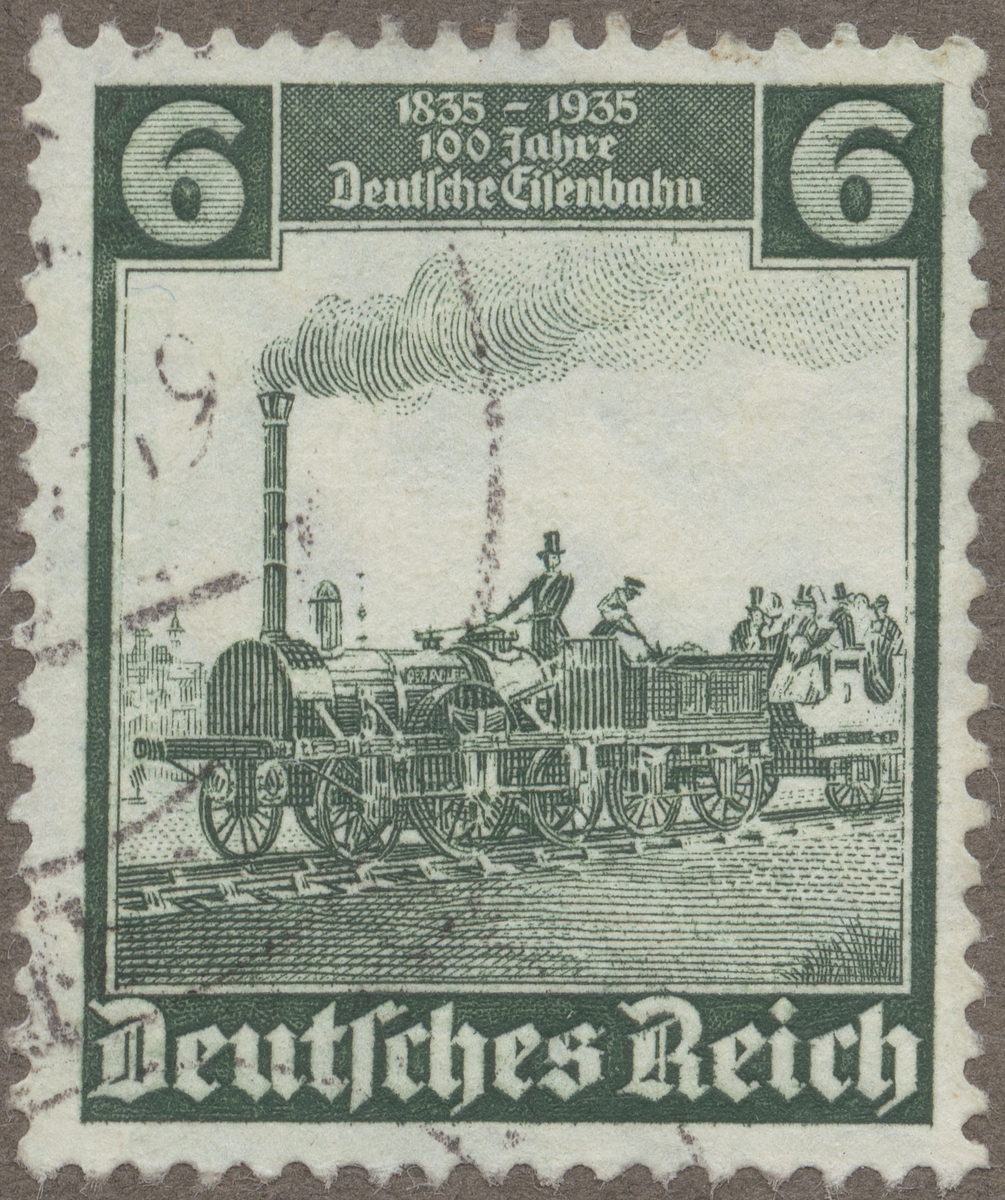 Frimärken ur Gösta Bodmans filatelistiska motivsamling, påbörjad 1950. Frimärke från Tyskland, 1935. Motiv av Tysklands första ånglokomotiv 1835. "De tyska järnvägarnas 100-årsjubileum. 1835-1935."