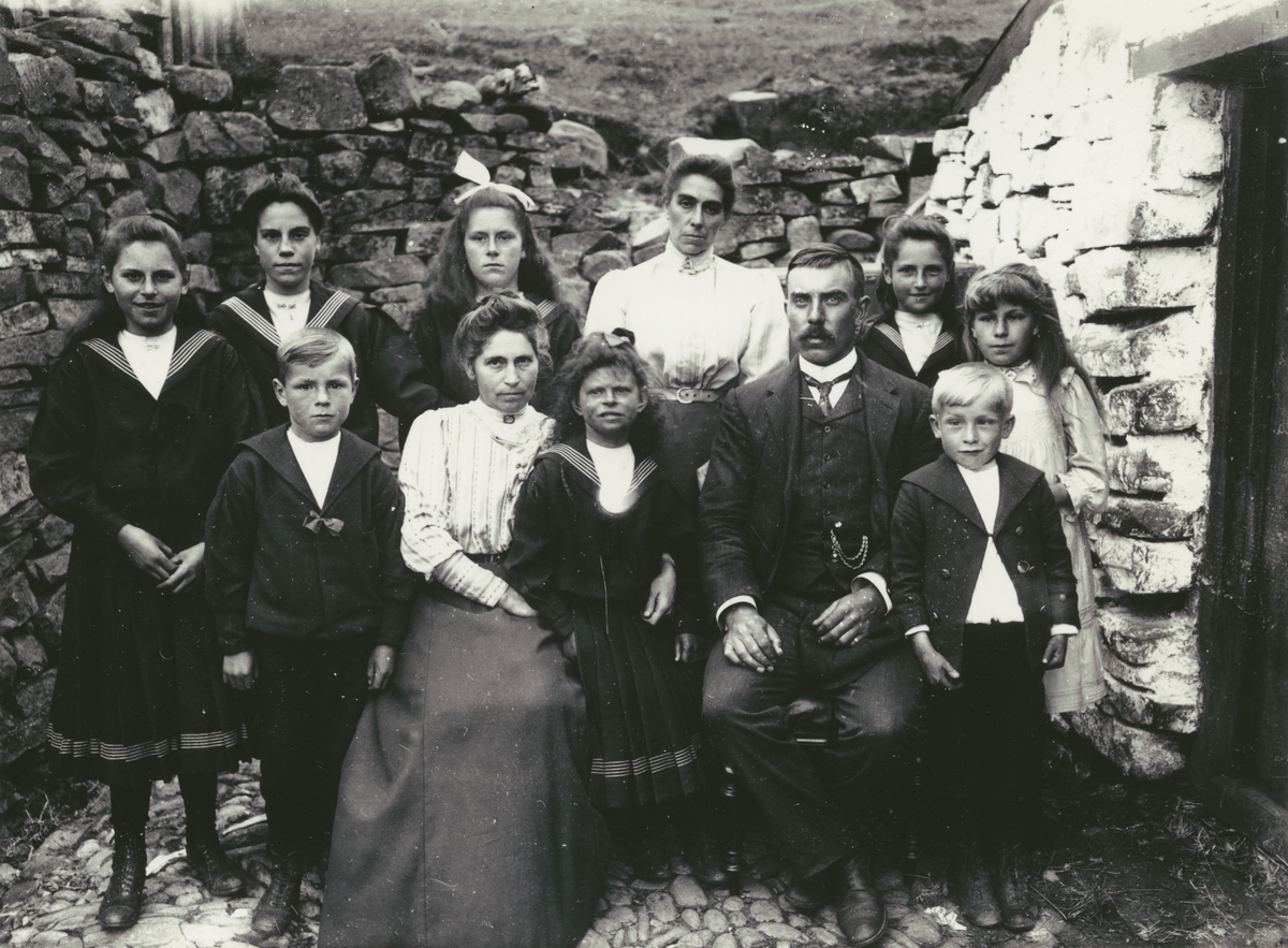 Bild från expedition i Antarktisområdet. Motif of a large family posing outside a stone house, 1912.
