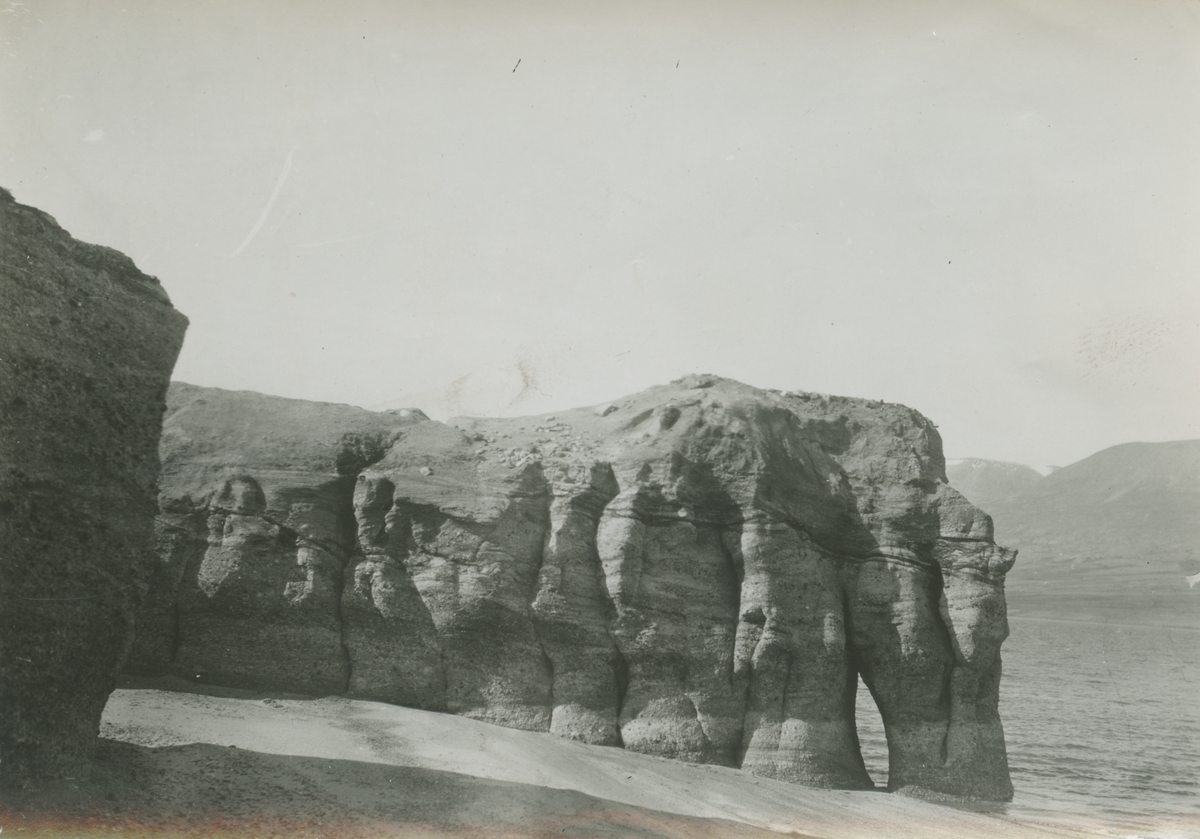 Fotografi från expedition till Östgrönland 1929. Dansk-svensk expedition under ledning av Lauge Koch. Svenska deltagare: Oscar Kulling och Helge Backlund. Motiv av märkligt formad klippa vid vattnet.
