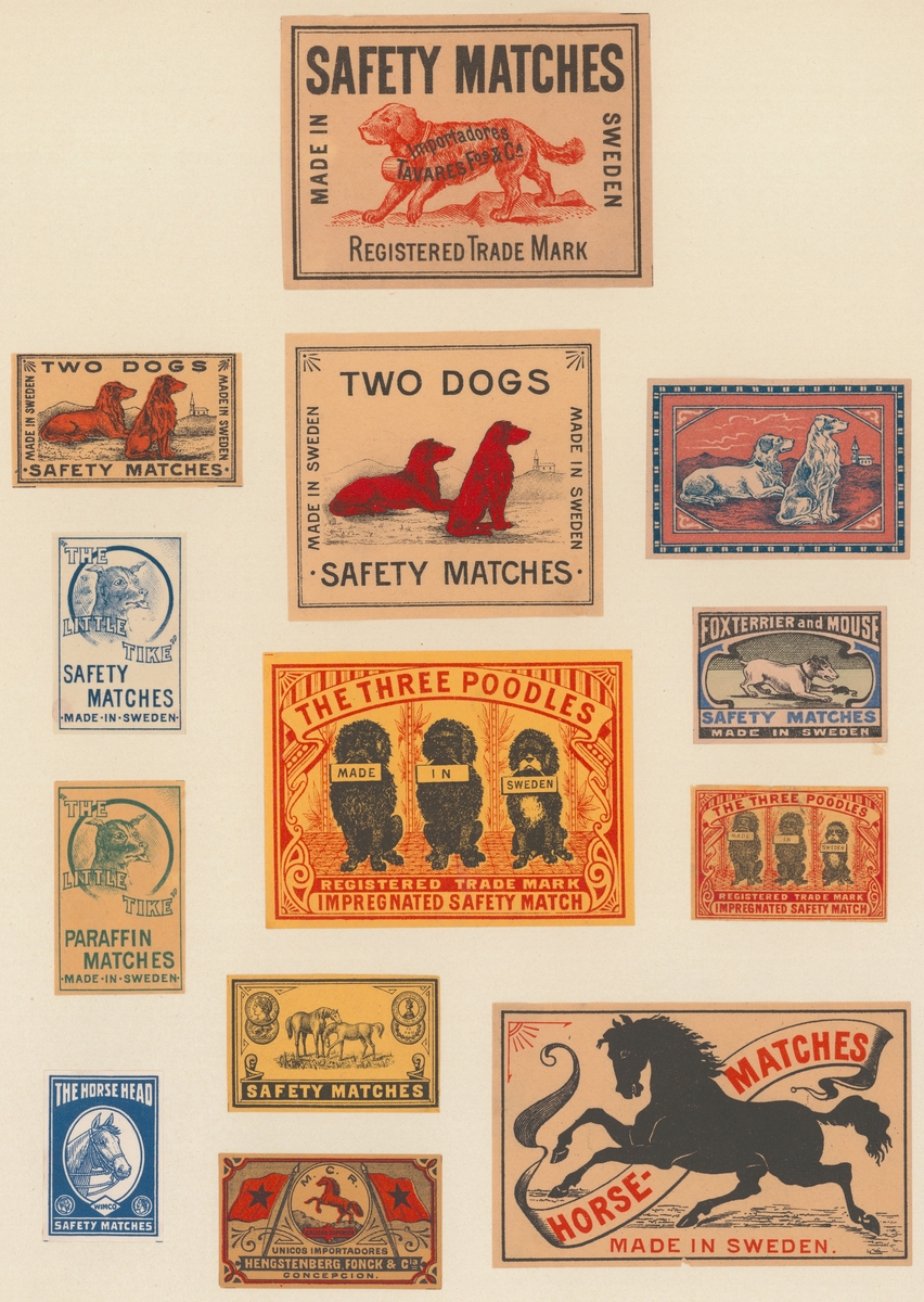 Etiketter för tändsticksaskar, från Svenskt Industri- och Handelsmuseum.