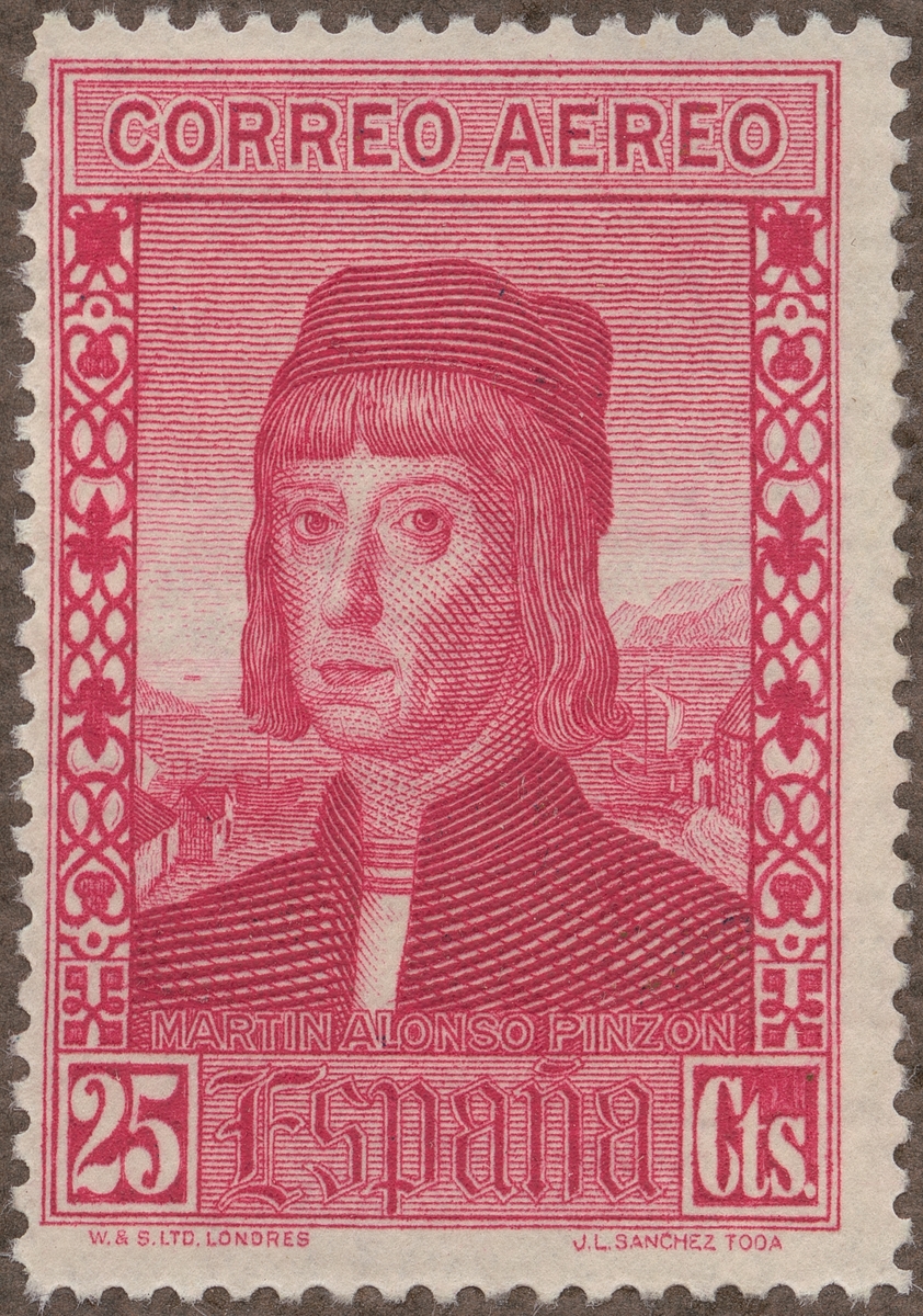 Frimärke från Spanien, 1930. Motiv av Portugisen Martin Alonso Pinzon 1441-1493. Chef på karavellen "Pinta" vid Columbus första resa över Atlanten: 1492.