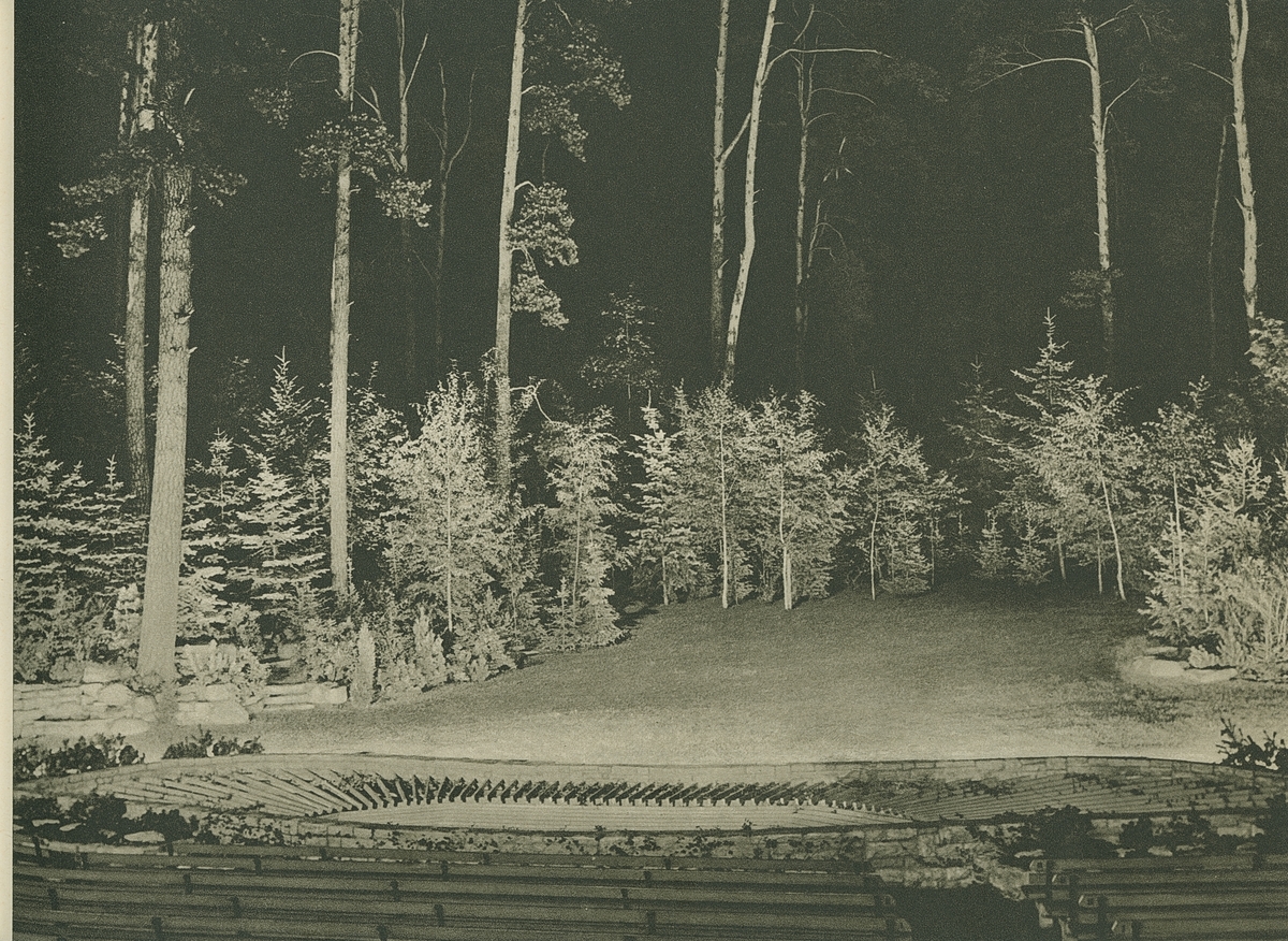 "Freilichtbühne", "Freilichttheater Friedrichshagen, Berlin, Kugelzonenspiegelleuchten und Ovalspiegelleuchten als Rampenlicht, Parabolspiegelleuchten zur Anstrahlung der Baumgruppen".