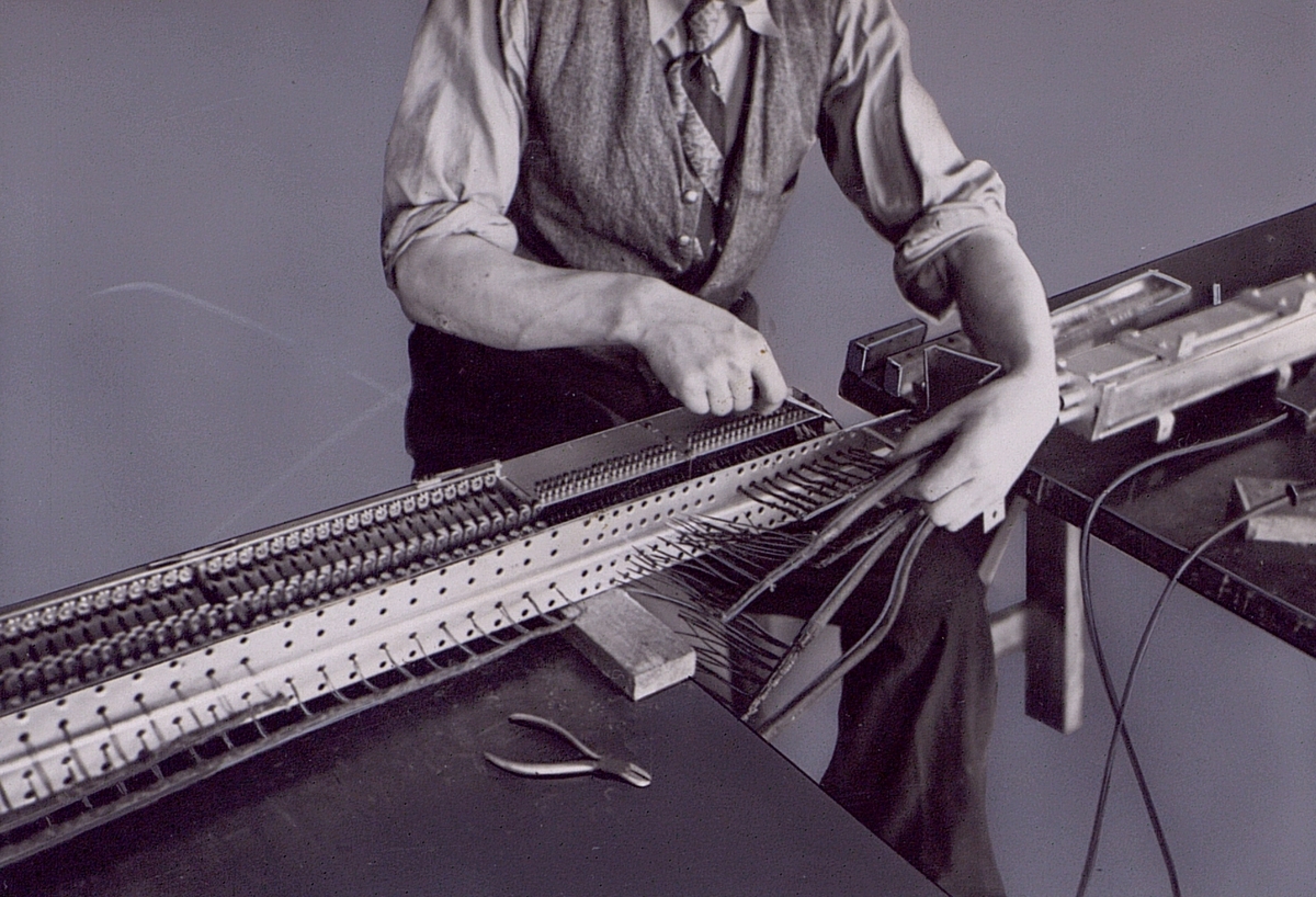 Montering av växel: Kablarna inlödas på provjacklisterna. Såsom synes ha växelbordskablarna redan inkopplats på åskledarstripsarna.