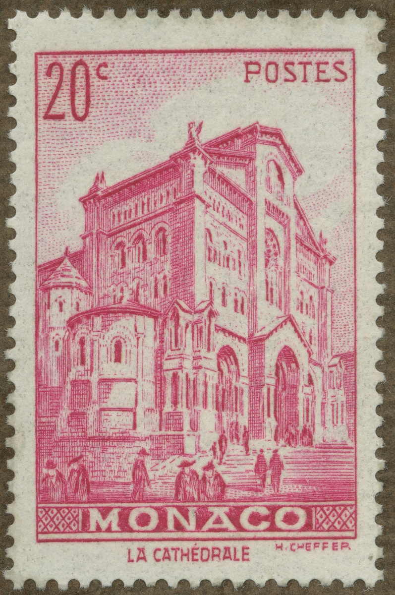 Frimärke från Monaco, 1939. Motiv av katedralen i Monaco.