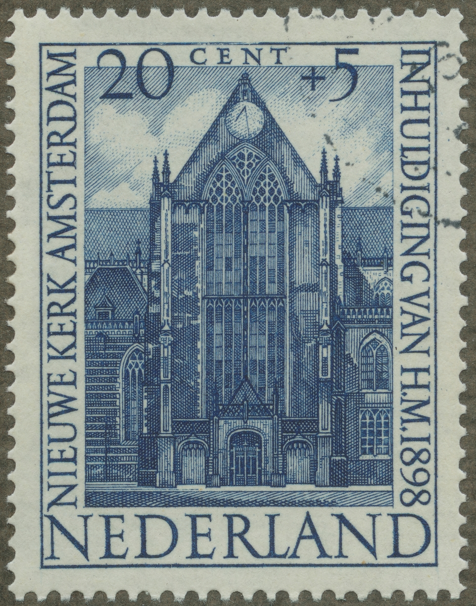 Frimärke från Nederländerna, 1948. Motiv av Nya Kyrkan i Amsterdam "1898, 50 år".