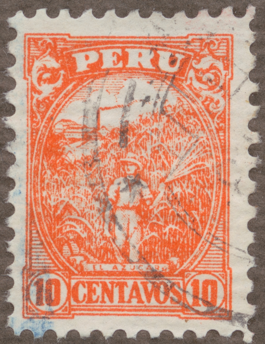 Frimärke från Peru, 1931. Motiv av sockerodling.