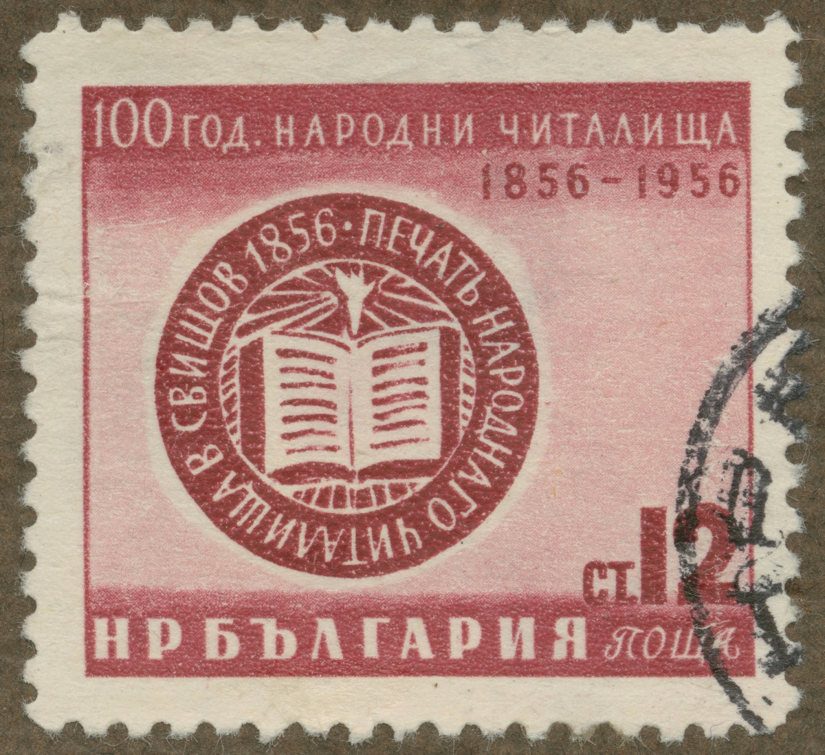 Frimärke från Bulgarien, 1956. Motiv av bibliotekets sigill. "100 årsminne av Folkbiblioteken 1856-1956".