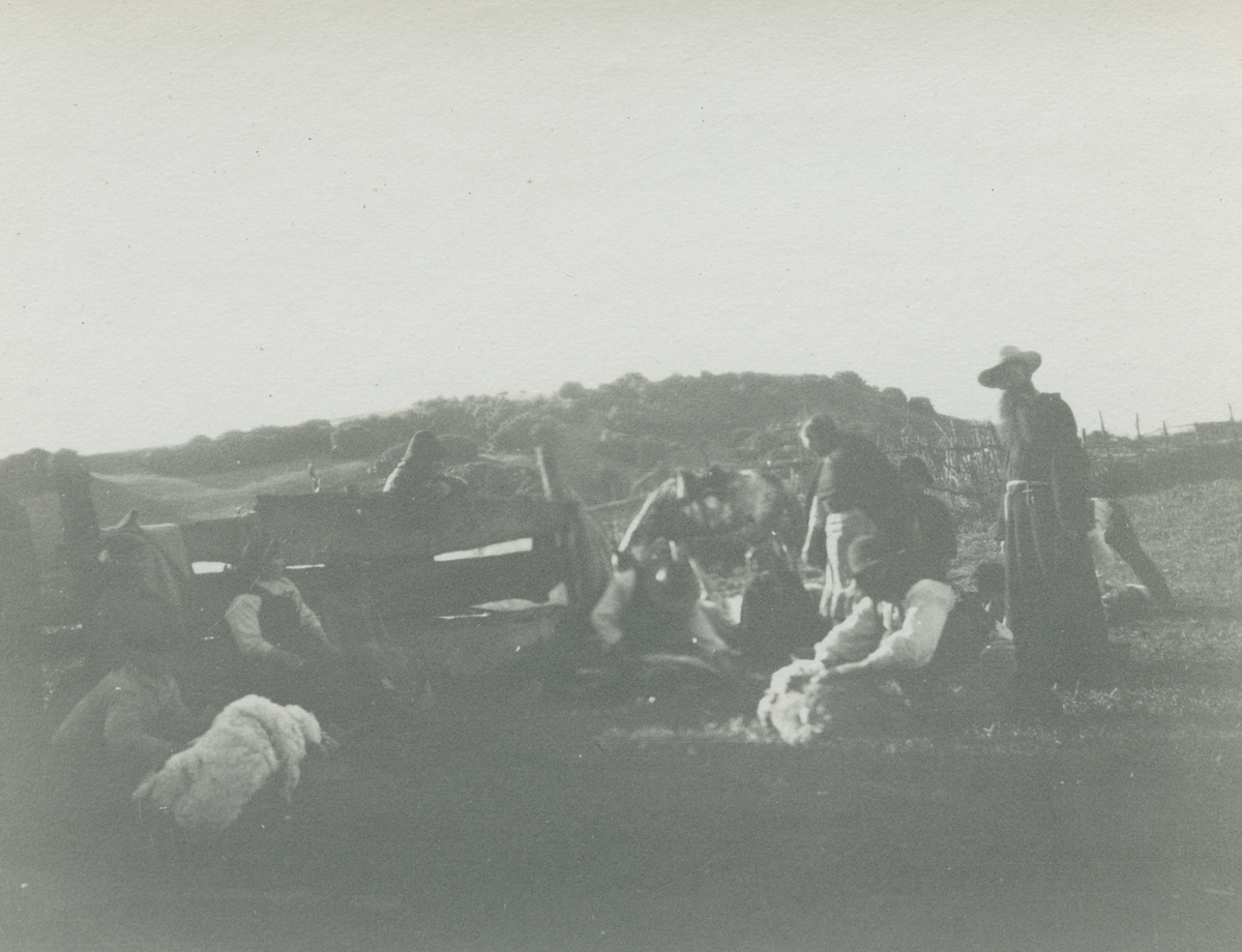 Fotografi från expedition till Peru 1920. Motiv av expeditionsdeltagare som slagit läger vid utkanten av djungeln.