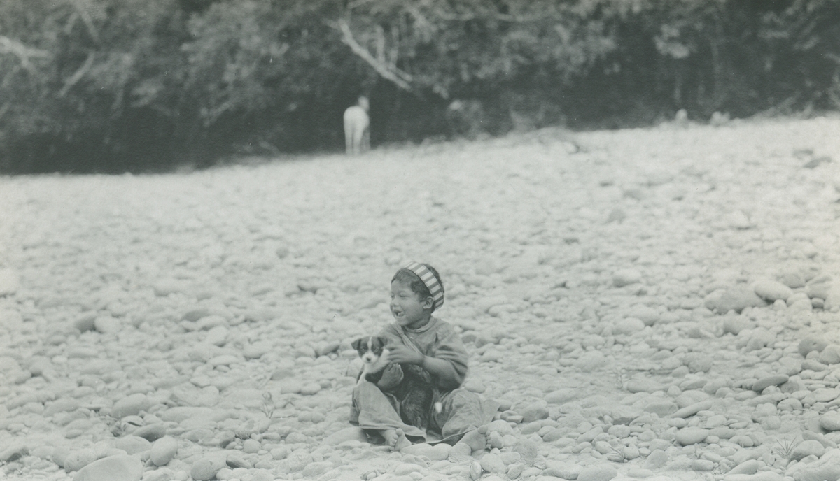 Fotografi från expedition till Peru 1920. Motiv av barn som sitter på stenig strand med hund i famnen.
