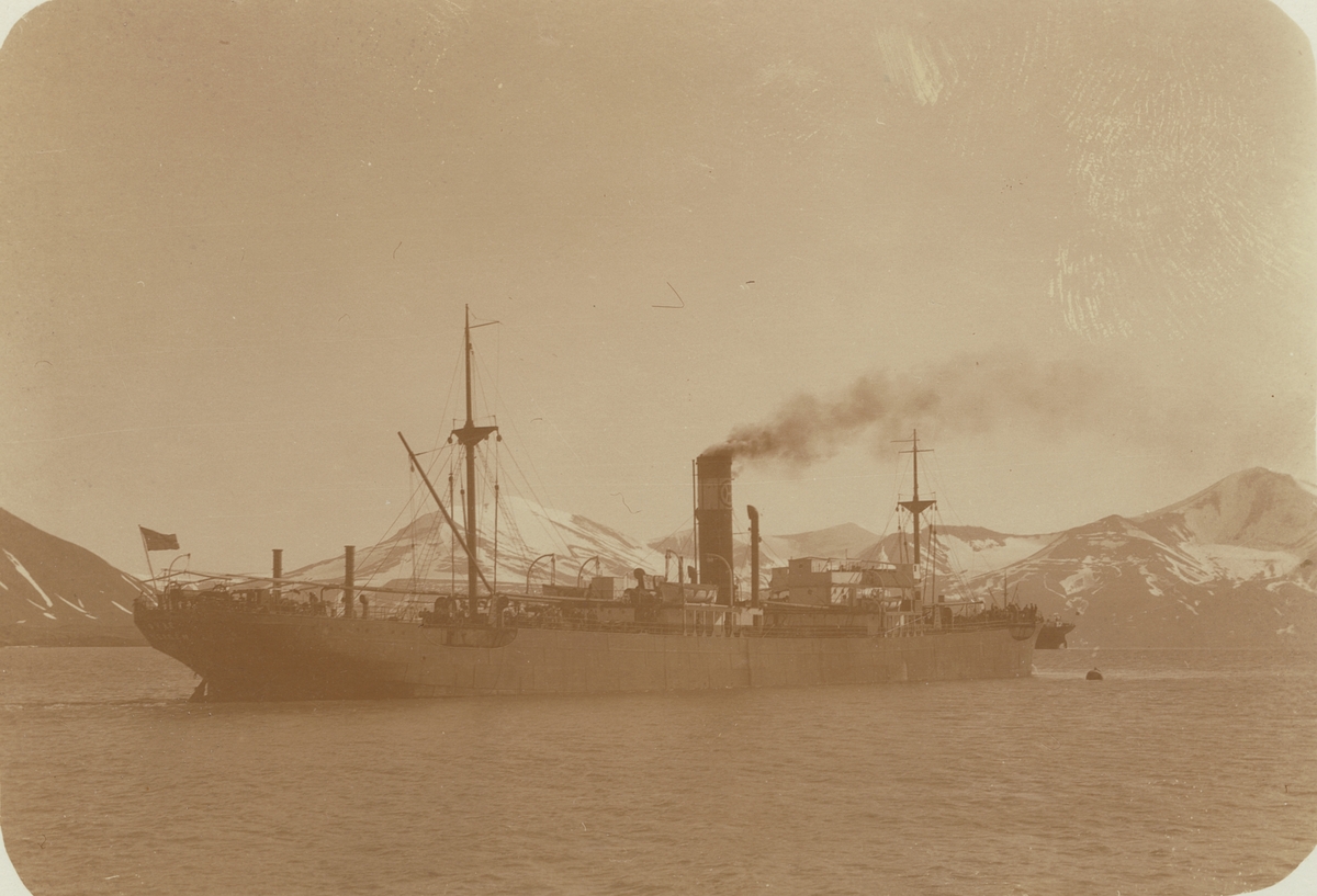 Fotografi från expedition till Spetsbergen. Motiv av stort fartyg på havet med snötäckta berg i bakgrunden.