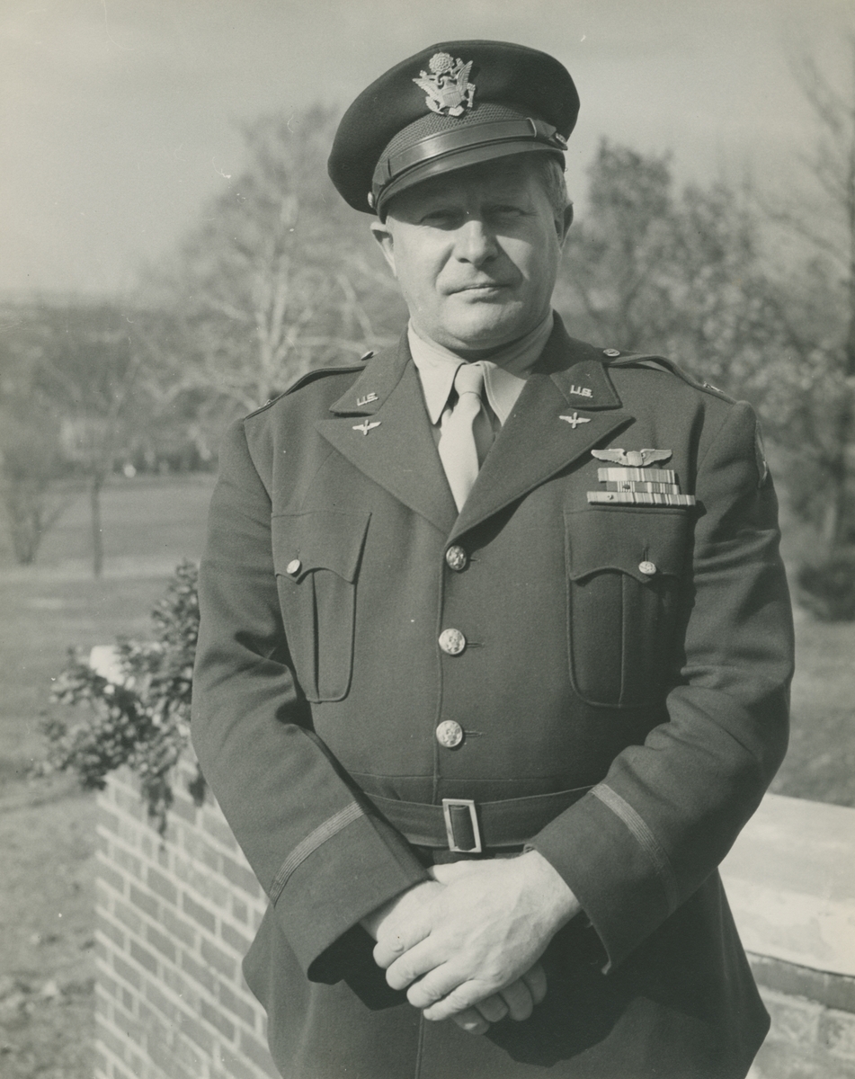 Fotografi från låda märkt Bernt Balchen. Balchen var norsk-amerikansk flygare, polarforskare och militär. Porträtt av Bernt Balchen iklädd uniform.