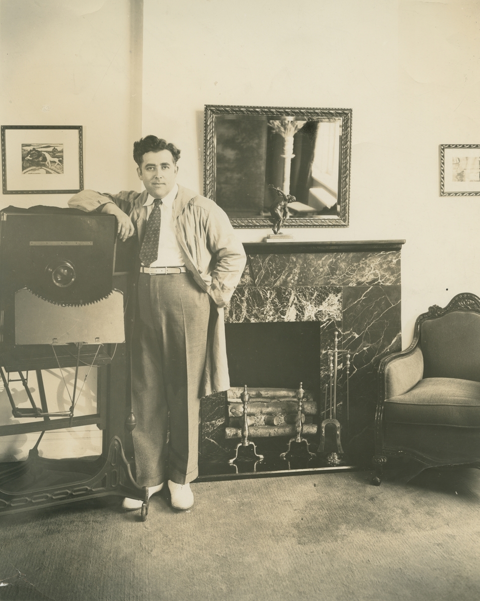 Fotografi från låda märkt Bernt Balchen. Balchen var norsk-amerikansk flygare, polarforskare och militär. Motiv av fotograf vid namn Vang som står i rum bredvid stor kamera.