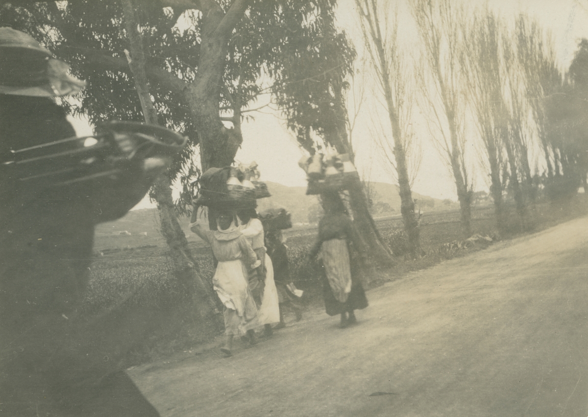 Fotografi från kuvert märkt med "Ernst Nordenskjöld". Motiv av kvinnor som går på väg och bär packning på sian huvuden.
