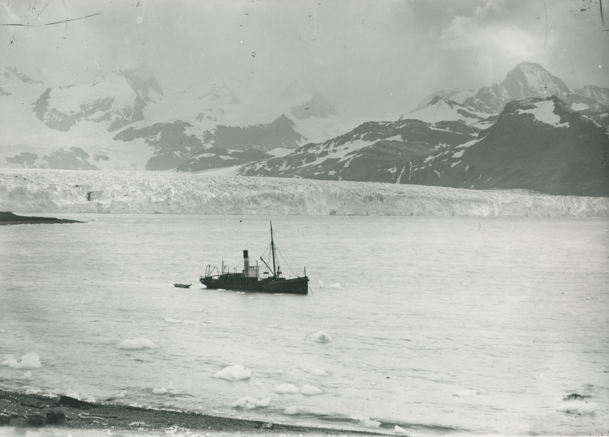 Bild från expedition i Antarktisområdet. Motiv av båt i hav med snötäckt bergslandskap i bakgrunden.