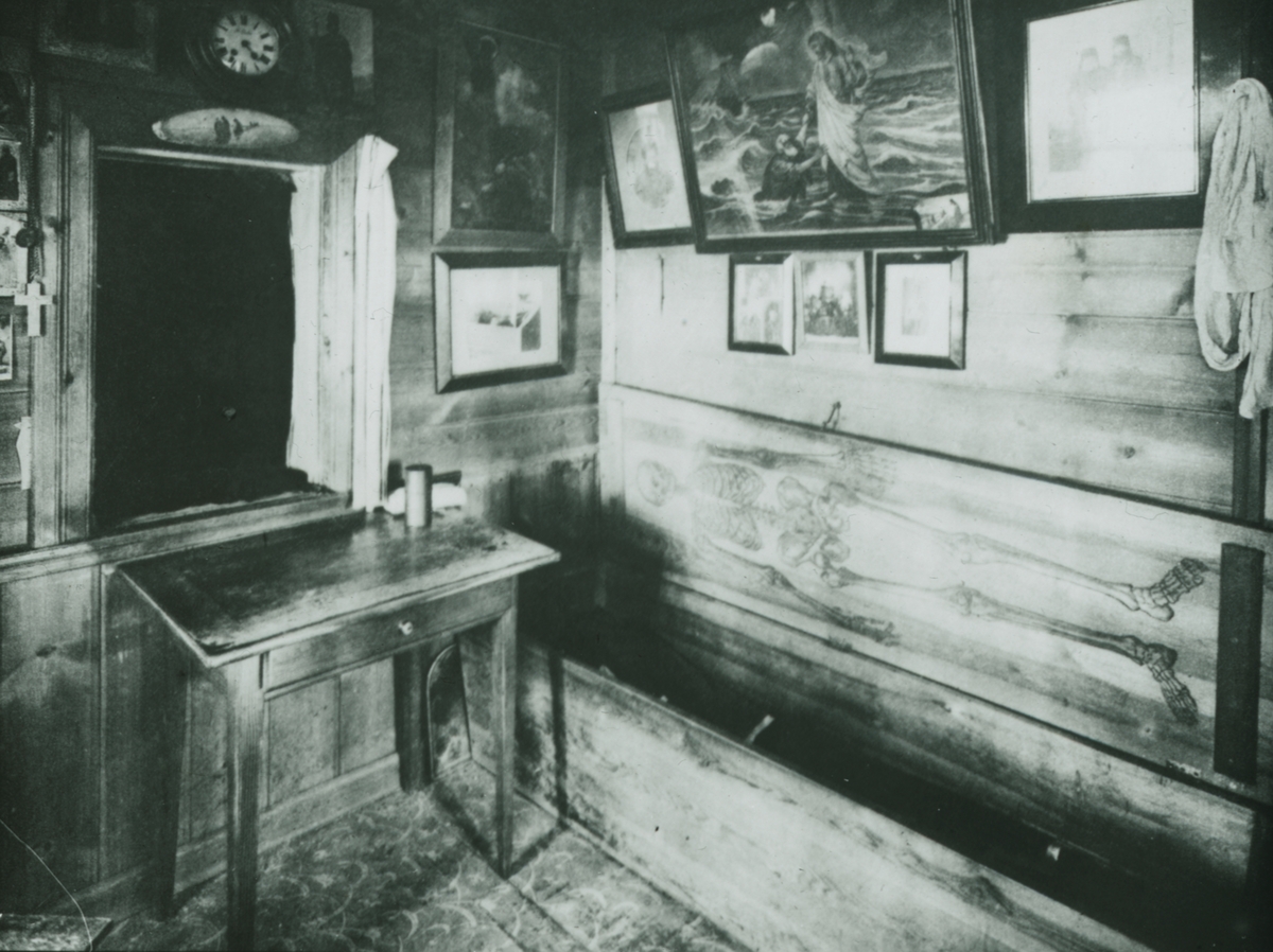 Glasnegativ med motiv av interiör av kloster, Smolensk Scythia. I bild en munkkista, skrivbord, tavlor.