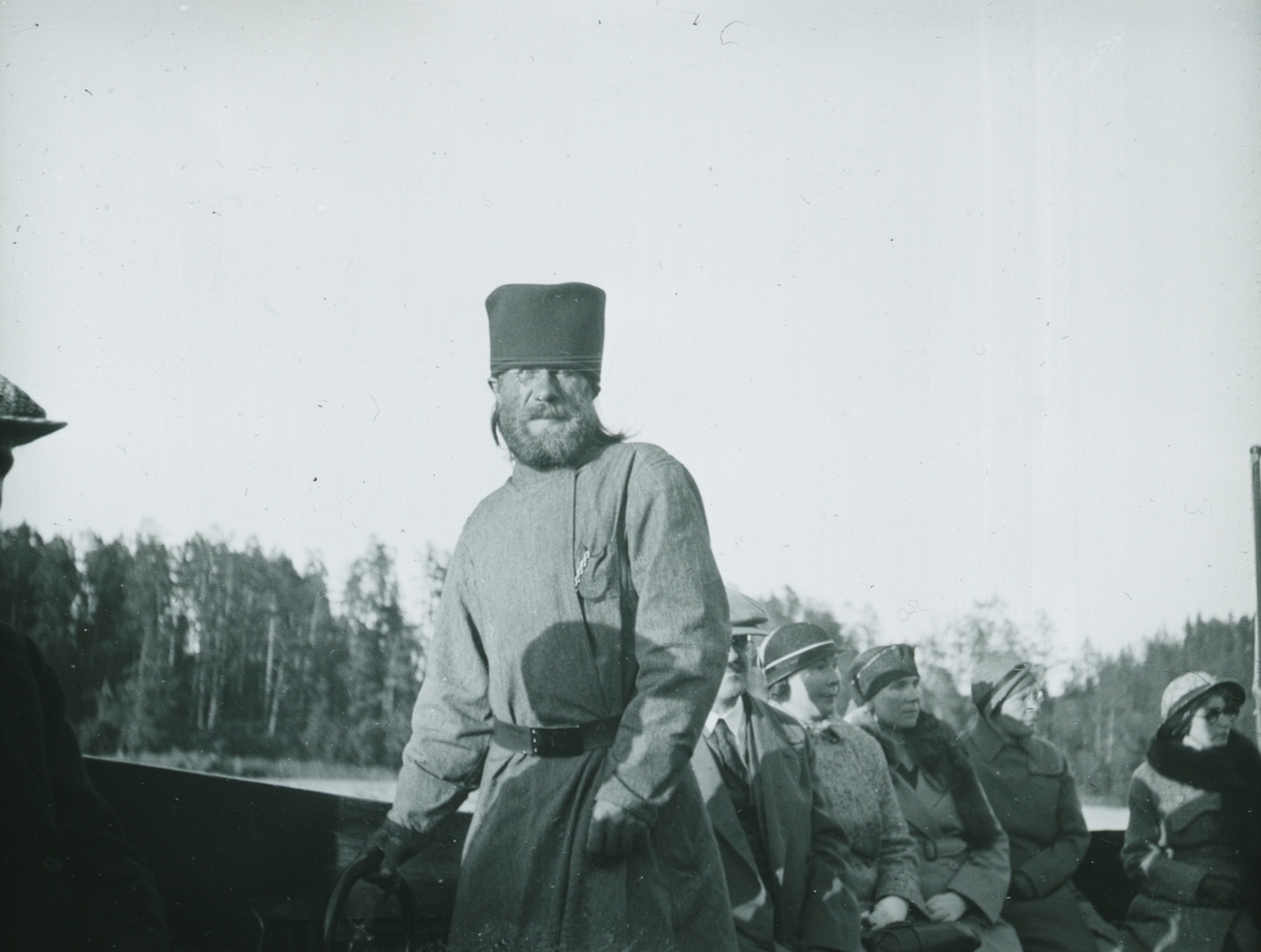Glasnegativ med motiv av man med huvudbonad på båt. På båten även ett antal passagerare,