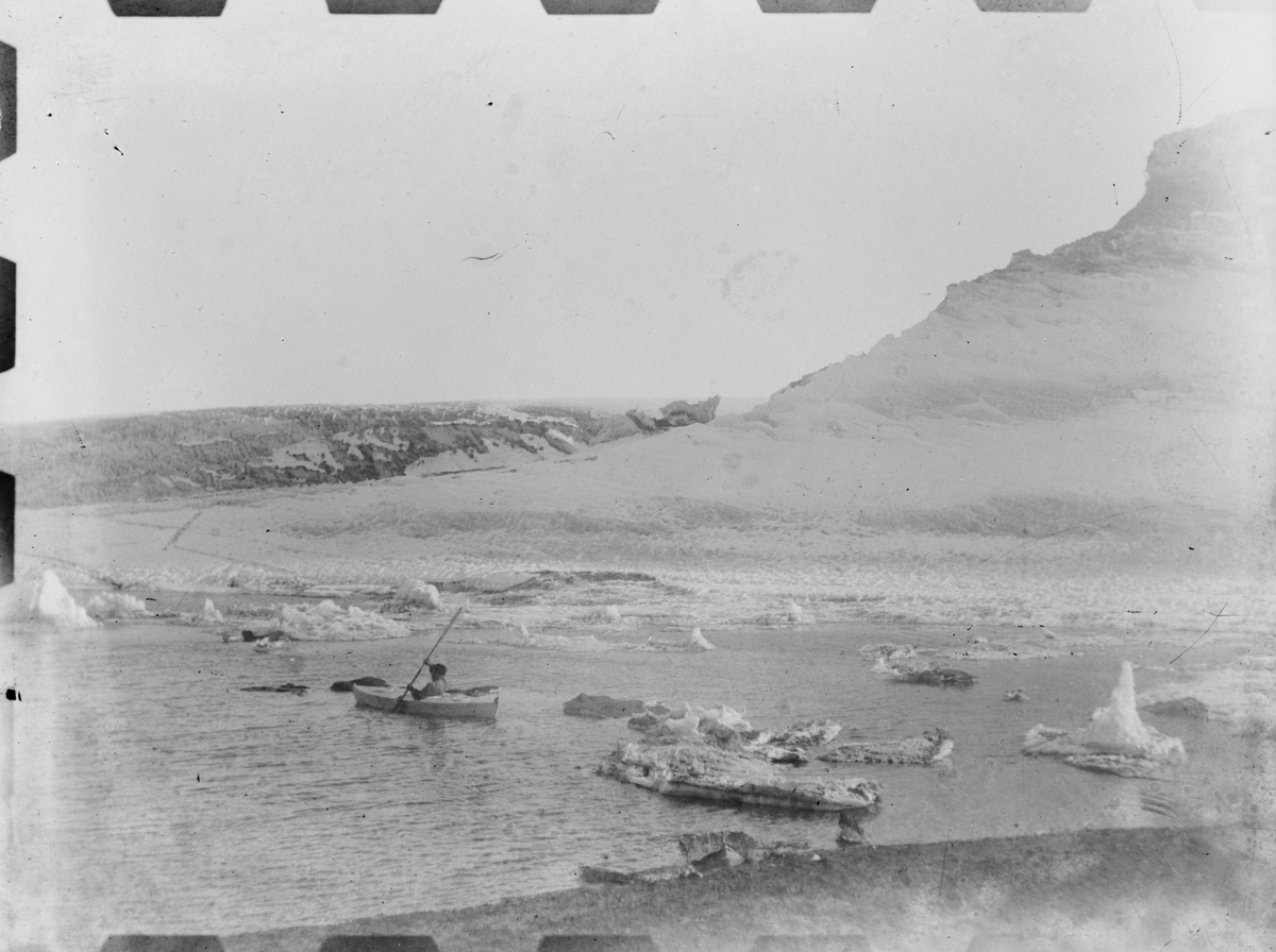 Fotografi från undsättningsexpeditionen med fartyget Uruguay 1903. Motiv av man i kajak vid snötäckt berg.